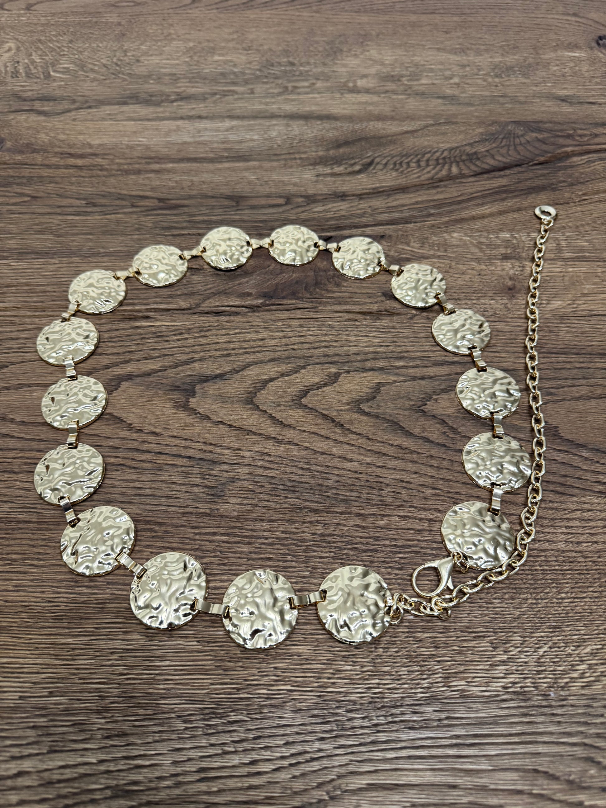 Κομψή χρυσή ζώνη με στρογγυλά μεταλλικά στοιχεία με ανάγλυφη υφή. Ιδανική για να αναδείξει φορέματα, πουκάμισα ή ψηλόμεσα παντελόνια. Προσθέτει λάμψη και στυλ σε κάθε εμφάνιση, είτε είναι casual είτε πιο βραδινή.