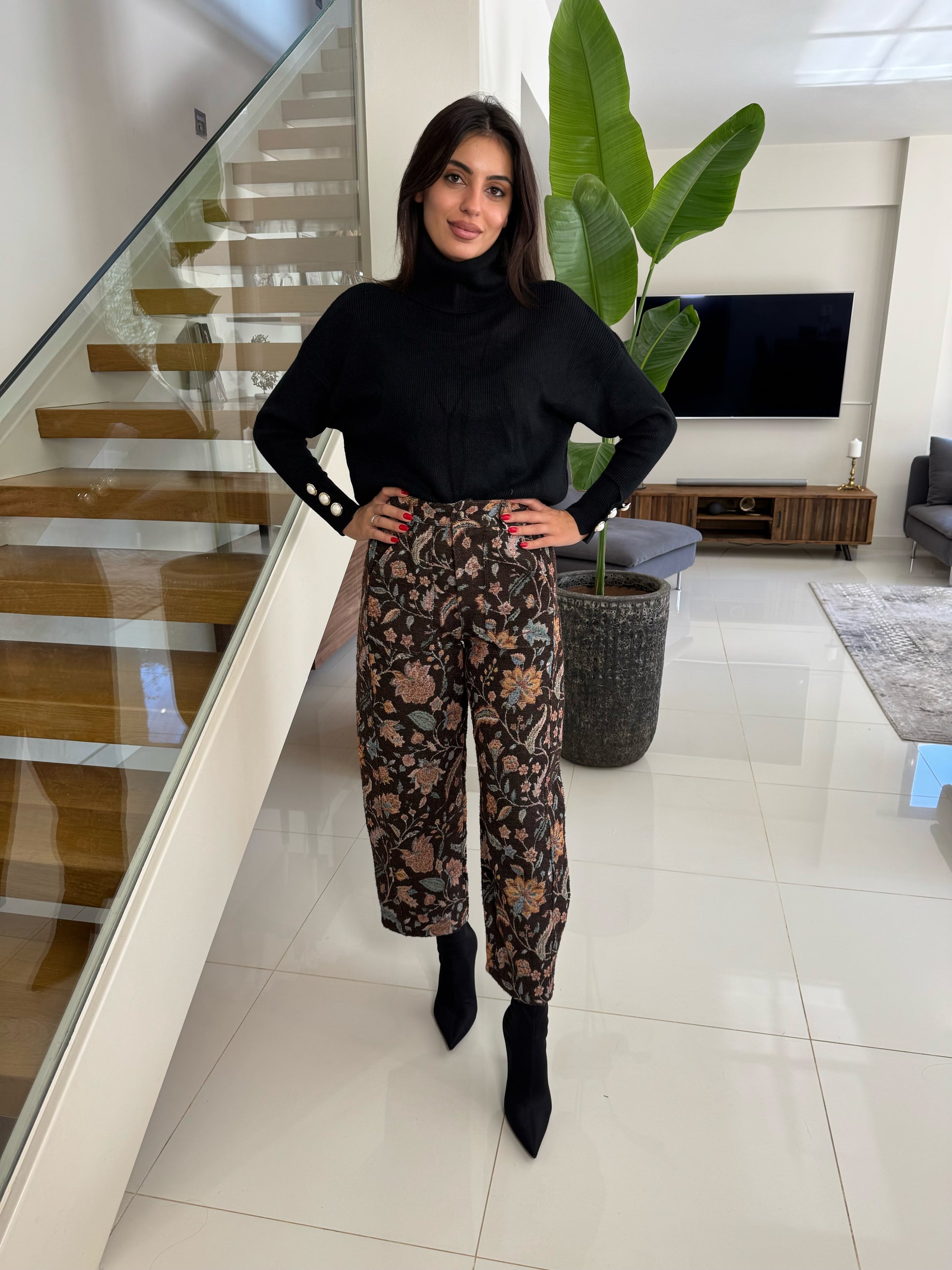 Κομψό παντελόνι με φαρδιά γραμμή και floral jacquard ύφασμα που χαρίζει πολυτέλεια και άνεση.