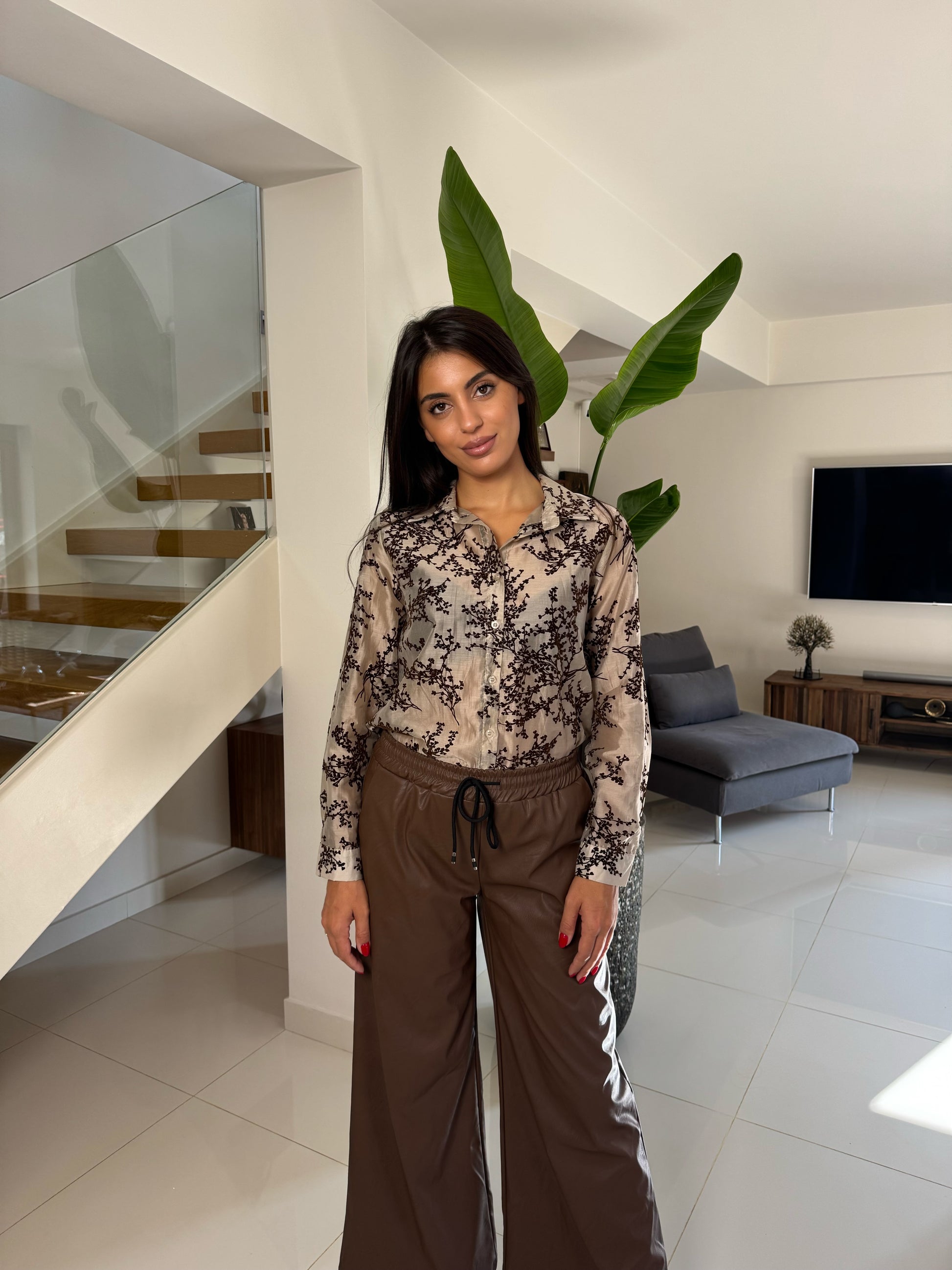 Ανάδειξε το στυλ σου με αυτό το κομψό πουκάμισο σε μπεζ απόχρωση με μαύρο βελούδινο μοτίβο.