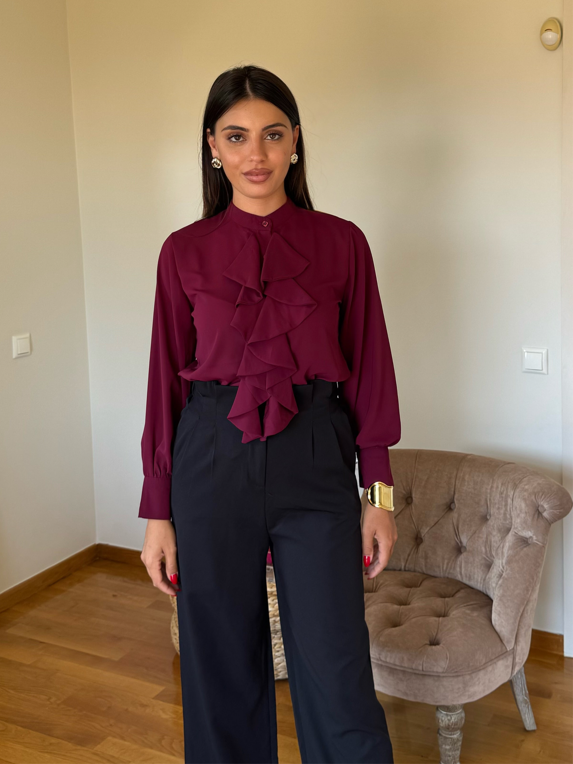 Ένα κομψό πουκάμισο σε εντυπωσιακή βυσσινί απόχρωση, που συνδυάζει θηλυκότητα και στυλ. Είναι κατασκευασμένο από απαλό, ελαφρύ ύφασμα που αγκαλιάζει όμορφα το σώμα, προσφέροντας άνεση και κομψότητα σε κάθε κίνηση.