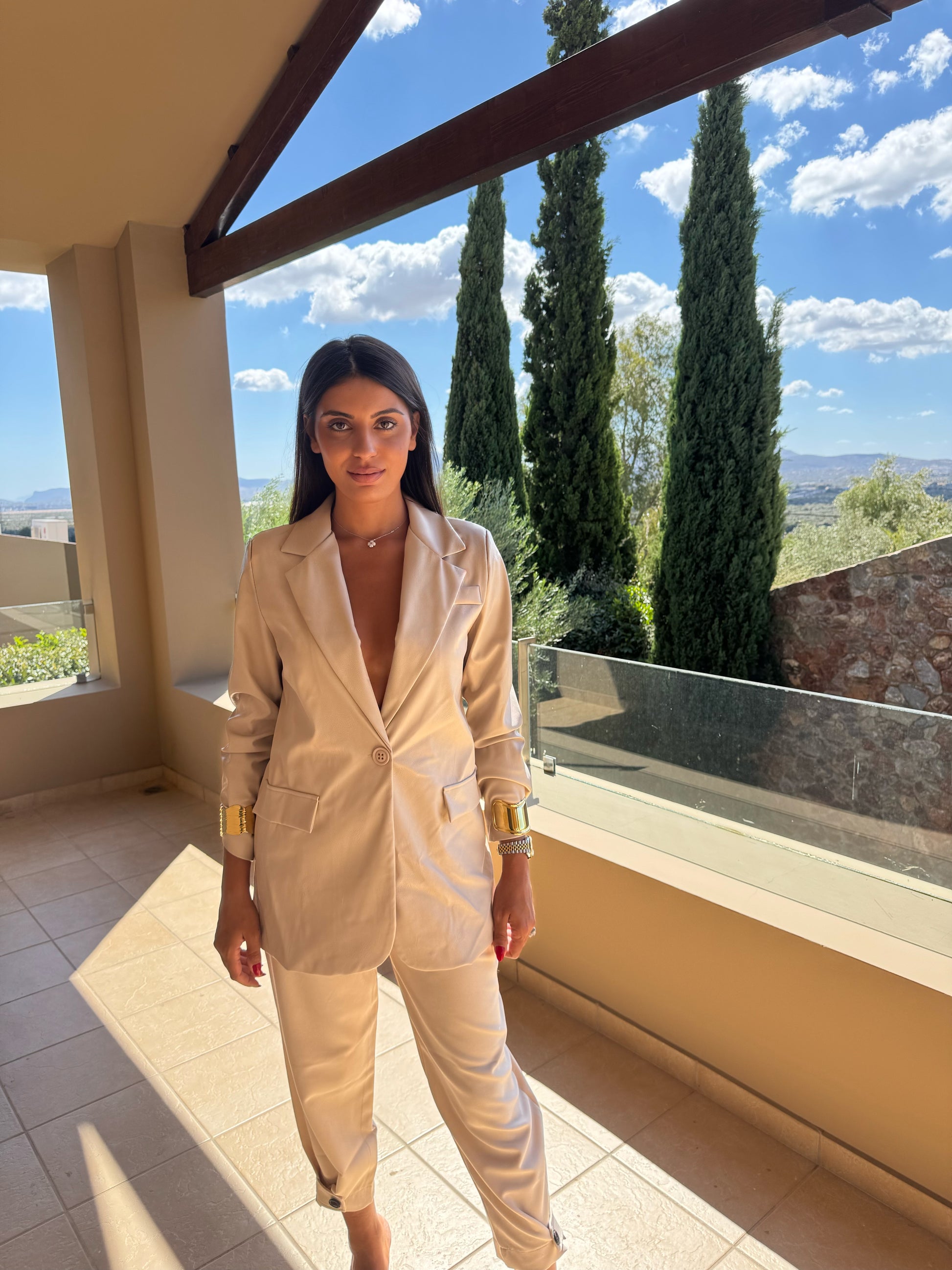 Αναβάθμισε το στυλ σου με αυτό το oversized δερμάτινο σακάκι σε κομψή μπεζ απόχρωση.