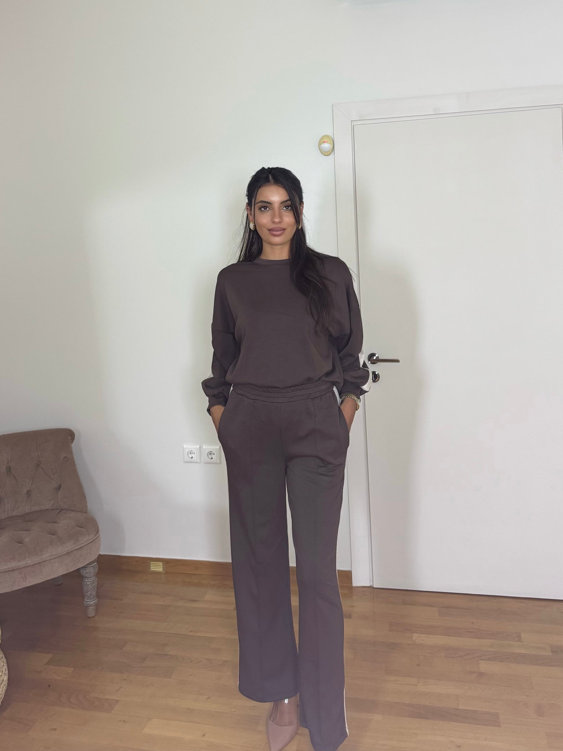 Κομψό καφέ σετ φόρμας με μπεζ ρίγα στο πλάι, ιδανικό για άνετες αλλά και στυλάτες εμφανίσεις. Περιλαμβάνει μπλούζα και παντελόνι με λάστιχο στη μέση, προσφέροντας άνεση και ευκολία στην κίνηση. Η μπεζ ρίγα χαρίζει ένα μοντέρνο αθλητικό look, ενώ το ουδέτερο χρώμα το κάνει εύκολο να συνδυαστεί με διάφορα παπούτσια και αξεσουάρ.