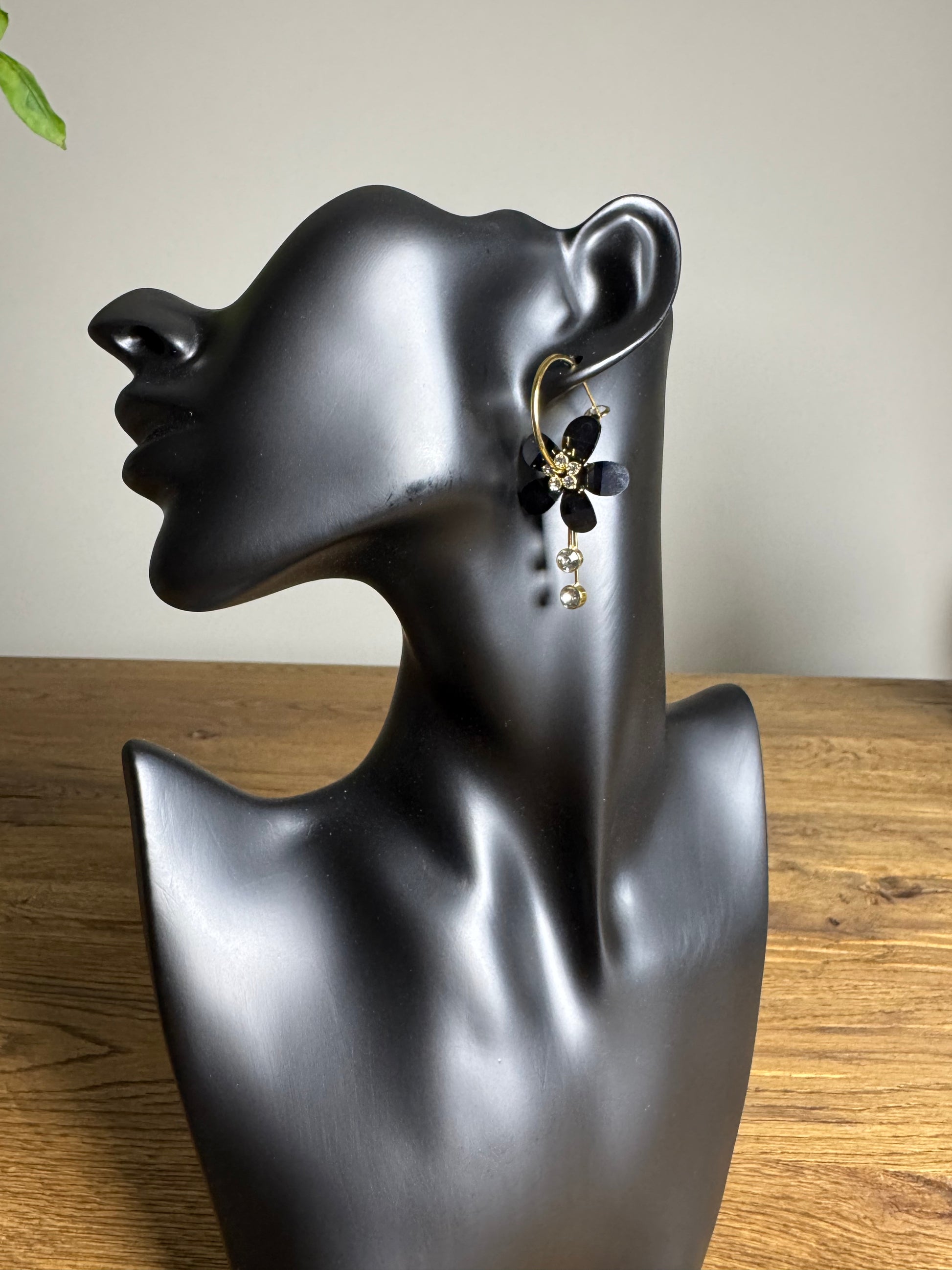 Ξεχώρισε με αυτά τα εντυπωσιακά μαύρα σκουλαρίκια σε σχήμα λουλουδιού. Ο μοντέρνος σχεδιασμός τους προσθέτει μυστήριο και κομψότητα σε κάθε εμφάνιση, ενώ το floral μοτίβο χαρίζει μια θηλυκή πινελιά.