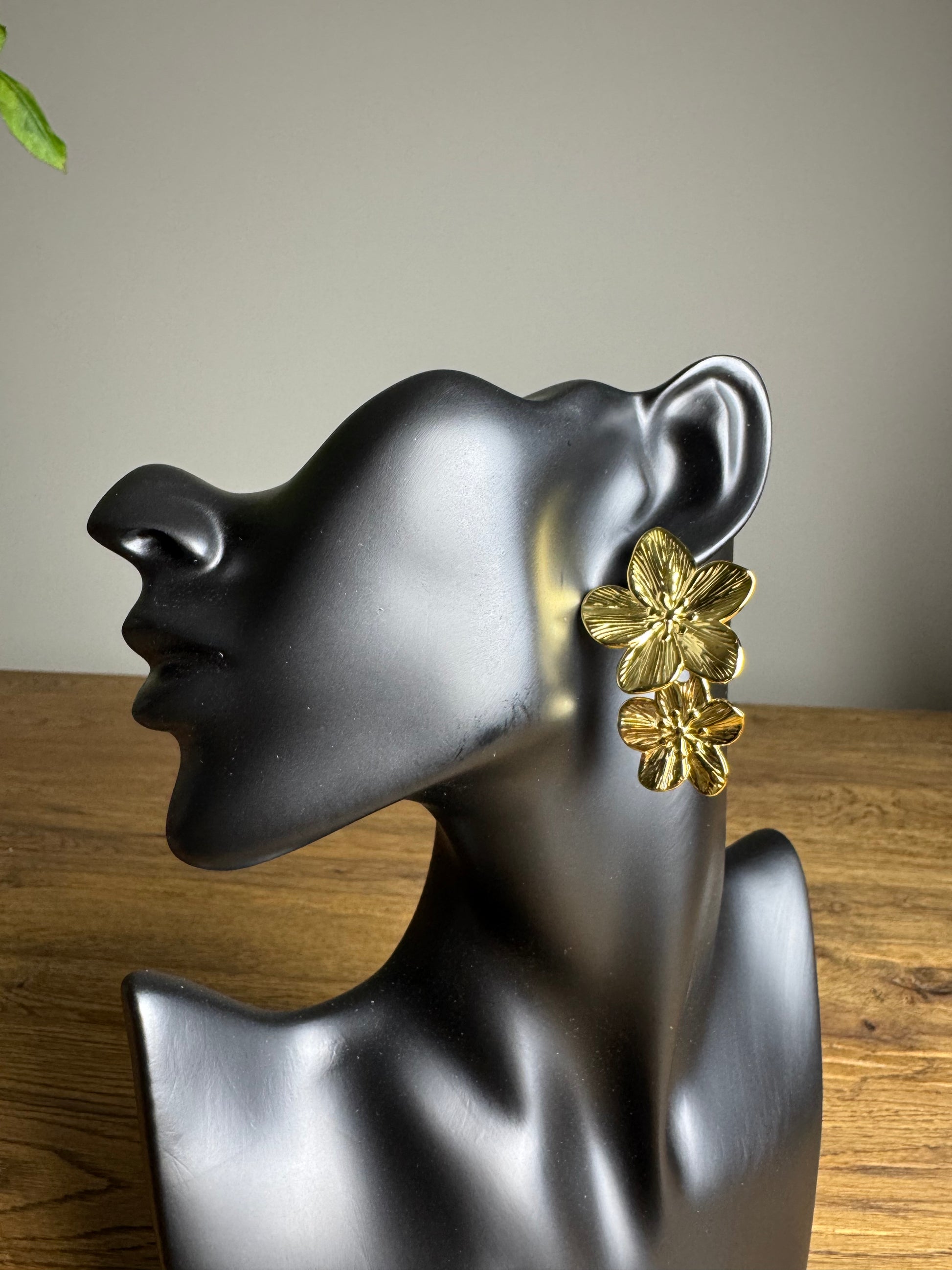 Εντυπωσιακά σκουλαρίκια με δύο χρυσά λουλούδια σε κατακόρυφη διάταξη. Το παιχνιδιάρικο αλλά και κομψό σχέδιό τους προσθέτει μια glam πινελιά σε κάθε outfit. Ιδανικά για βραδινές εξόδους, εκδηλώσεις ή για να απογειώσουν ένα απλό look με λάμψη και στυλ.