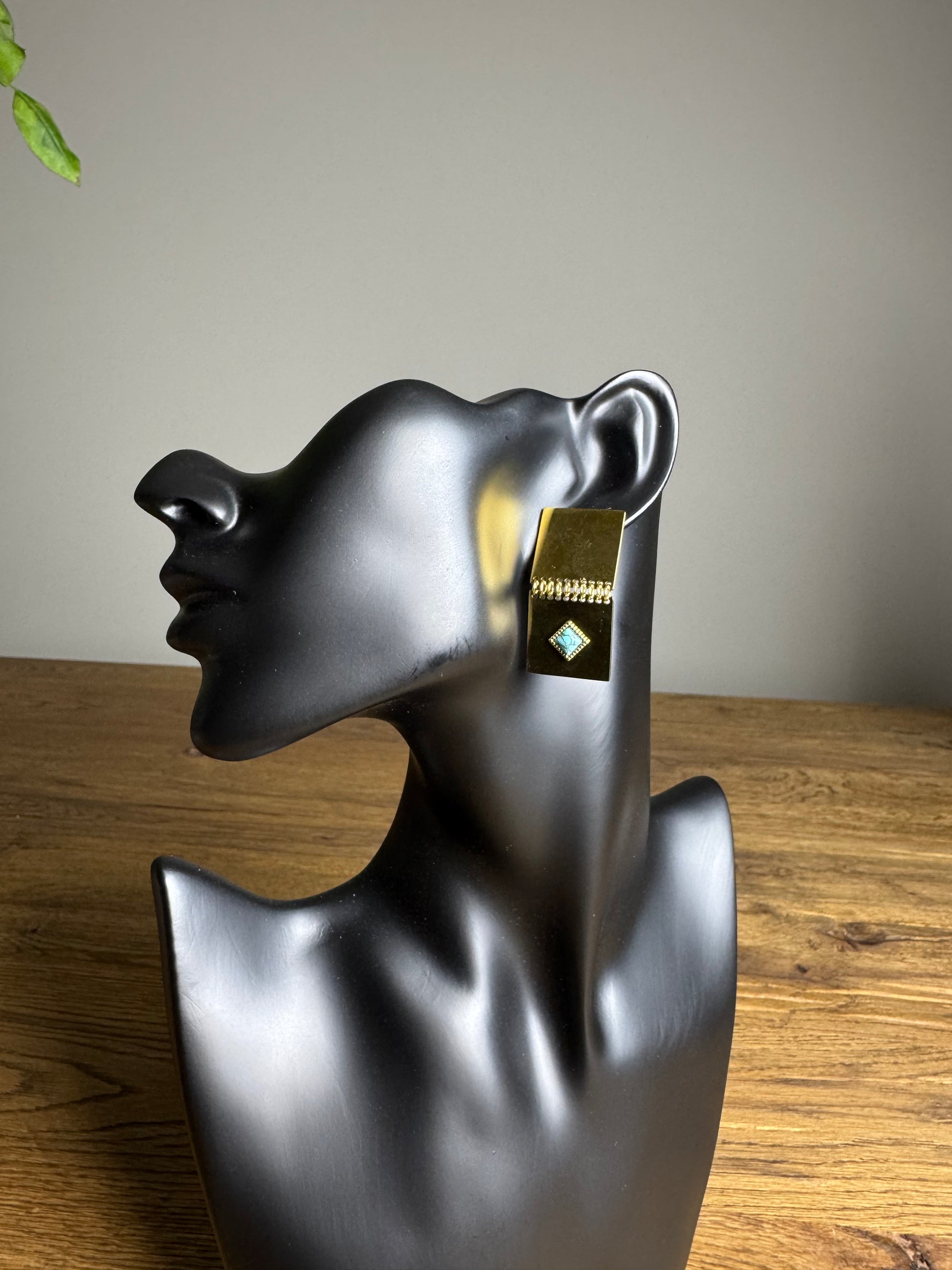 Λαμπερά τετράγωνα σκουλαρίκια με εντυπωσιακή μπλε πέτρα στο κέντρο. Ο κομψός σχεδιασμός τους συνδυάζει την απλότητα με την πολυτέλεια, κάνοντάς τα ιδανικά τόσο για καθημερινές εμφανίσεις όσο και για πιο ιδιαίτερες περιστάσεις.