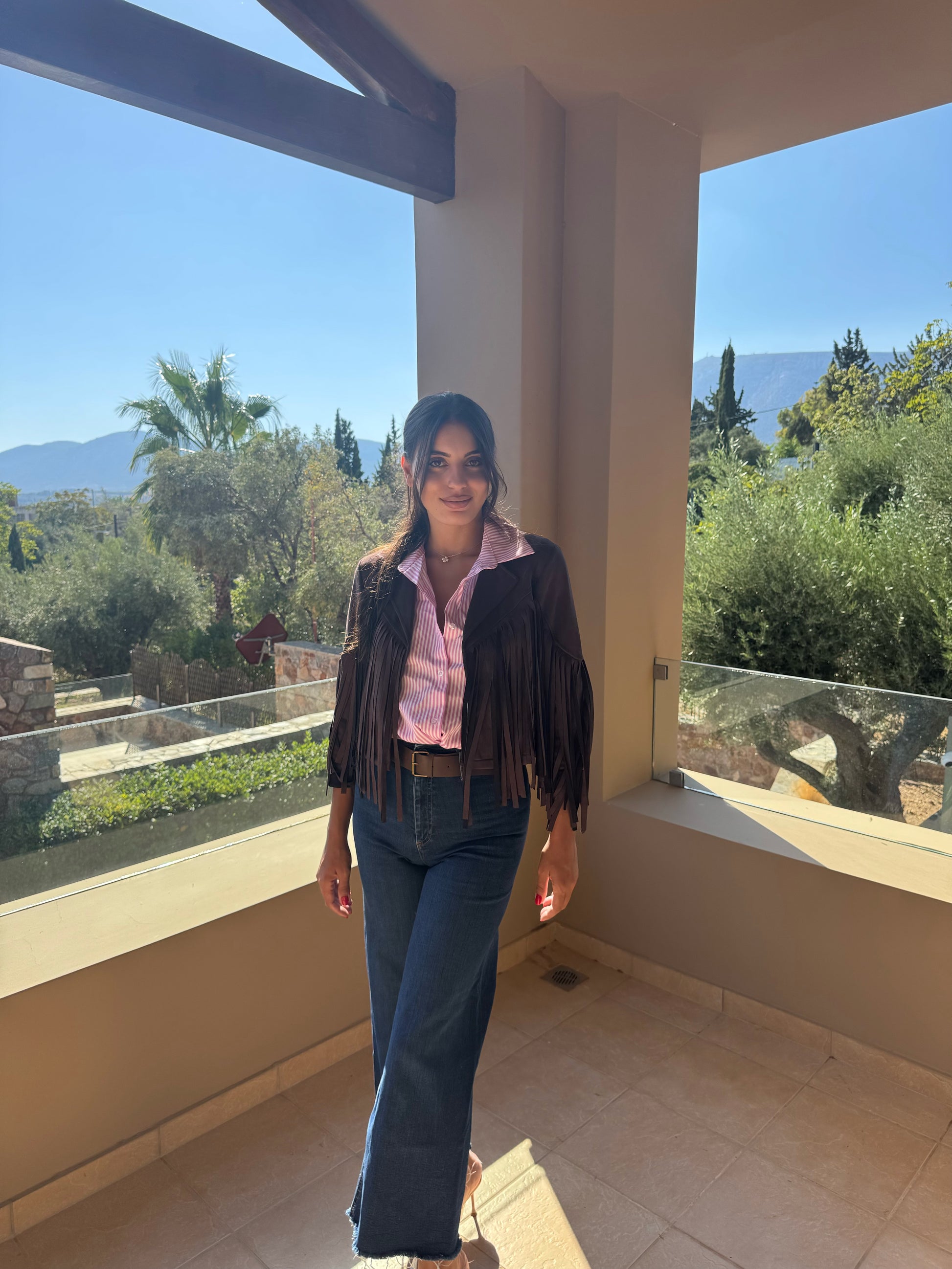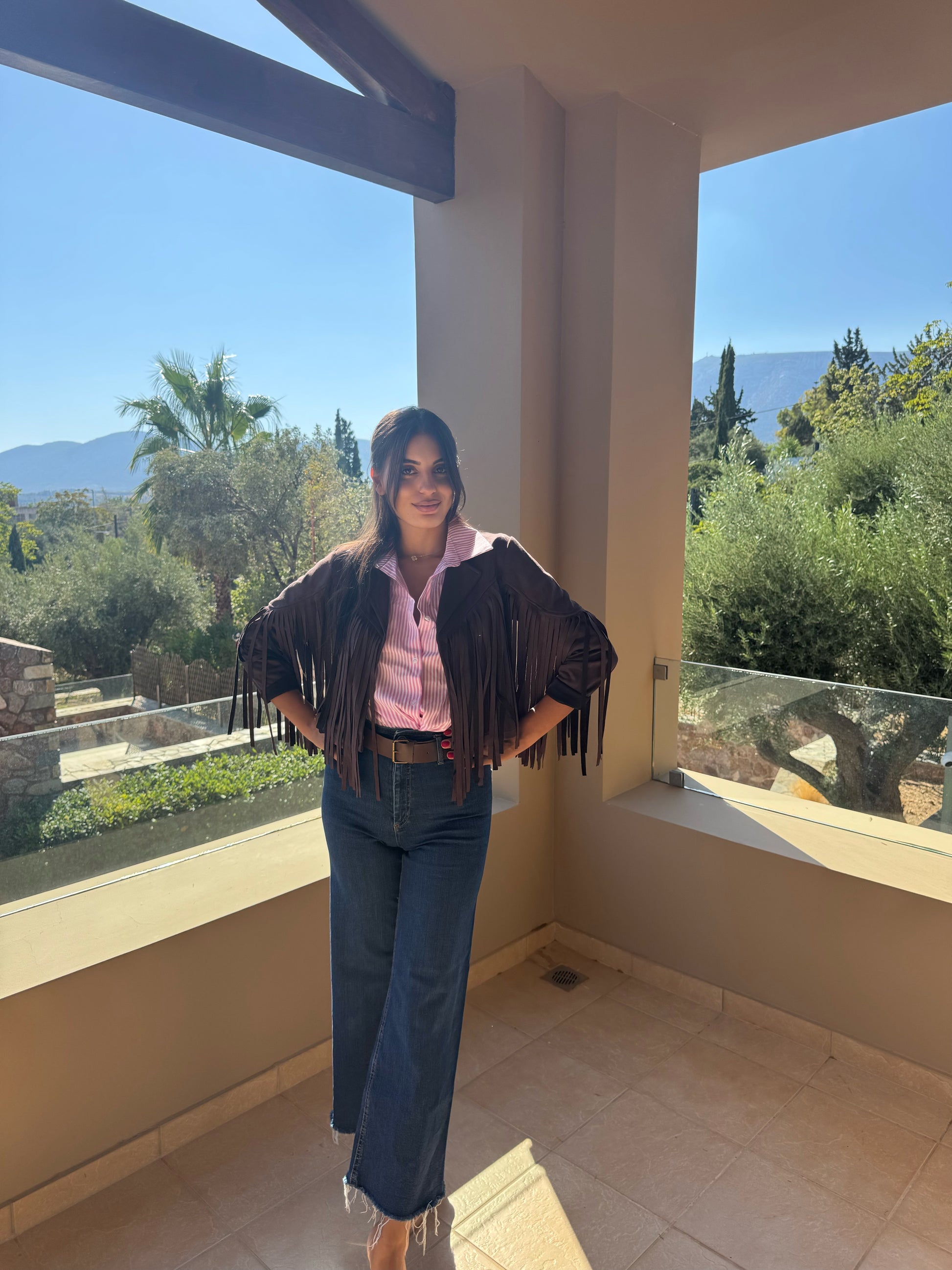 Ανανεώστε το στυλ σας με αυτό το εντυπωσιακό καστόρινο κοντό τζάκετ με κρόσια. Είναι ιδανικό για casual αλλά και πιο ιδιαίτερες εμφανίσεις, χαρίζοντας μια boho και ταυτόχρονα μοντέρνα αισθητική.