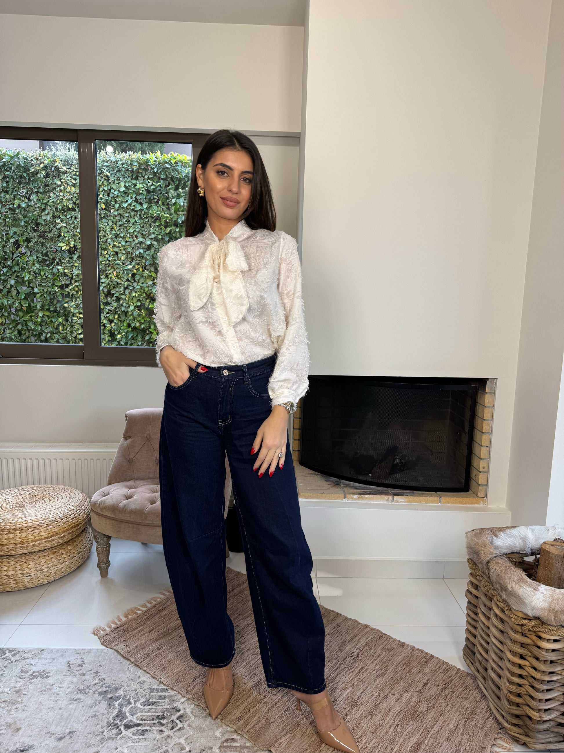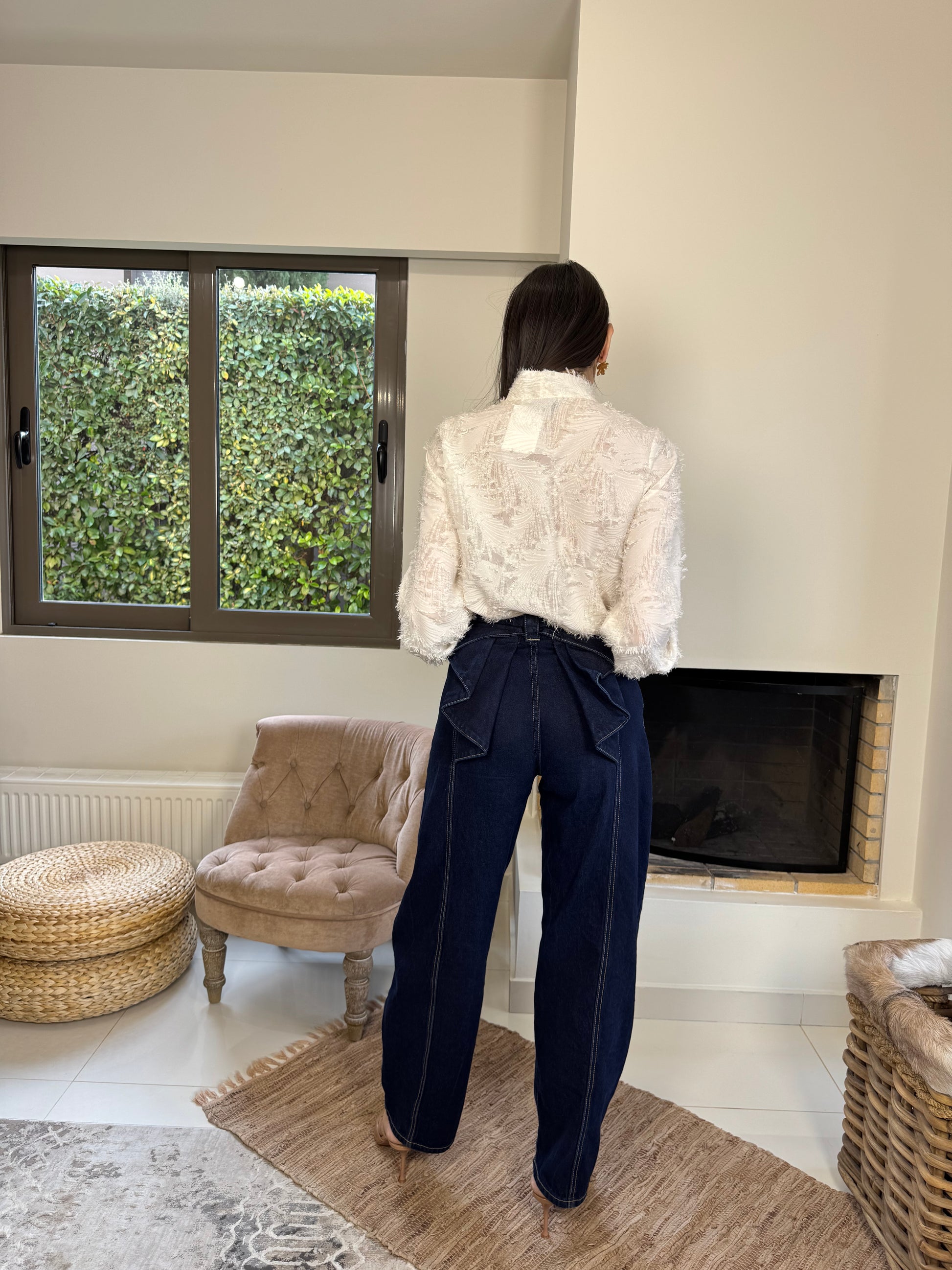 Κομψό τζιν παντελόνι με ιδιαίτερη λεπτομέρεια φιόγκου στο πίσω μέρος που το κάνει να ξεχωρίζει. Συνδυάζει άνεση και θηλυκότητα, προσθέτοντας μια μοντέρνα πινελιά σε κάθε εμφάνιση. Ιδανικό για καθημερινά αλλά και πιο προσεγμένα looks.