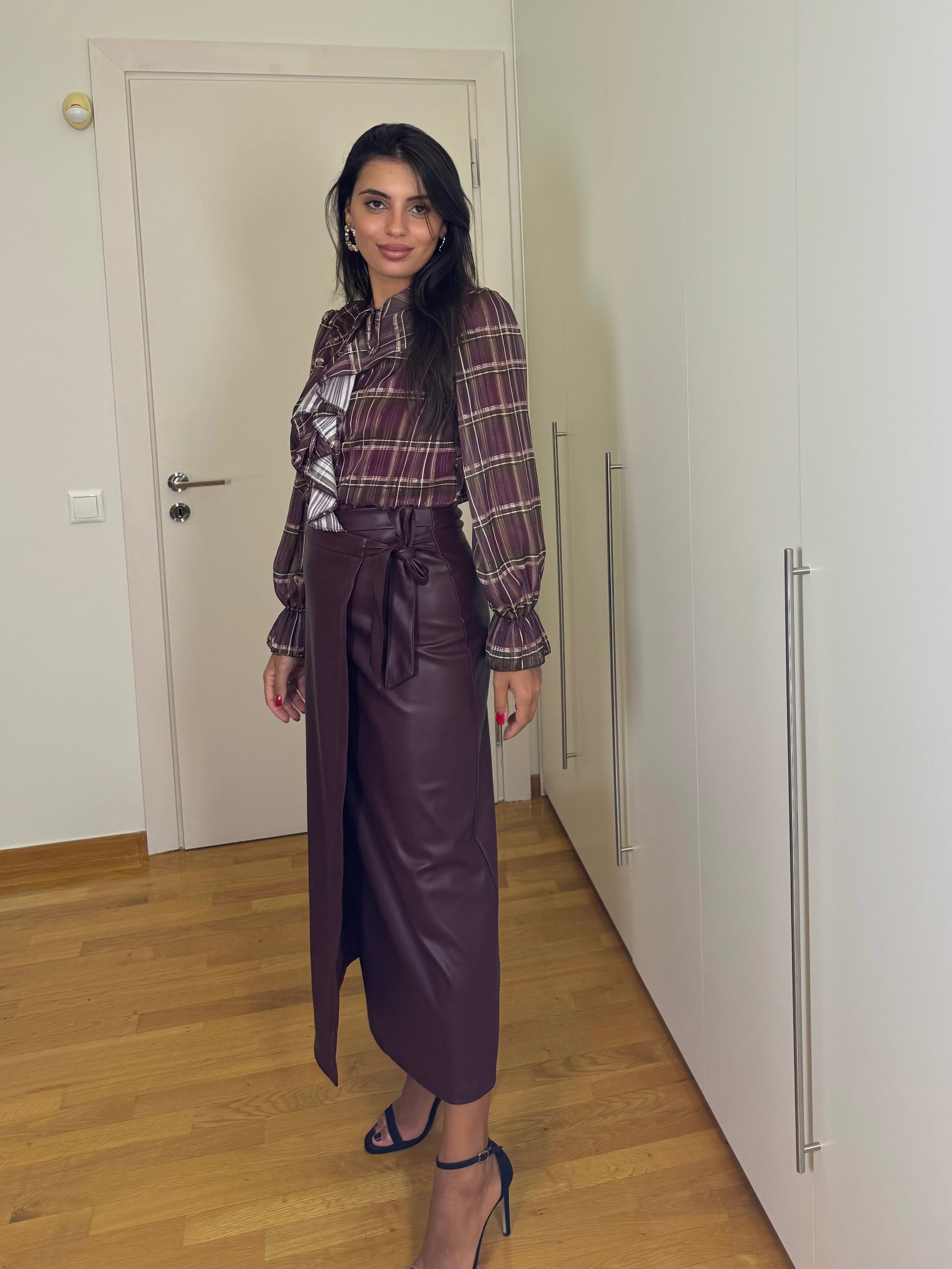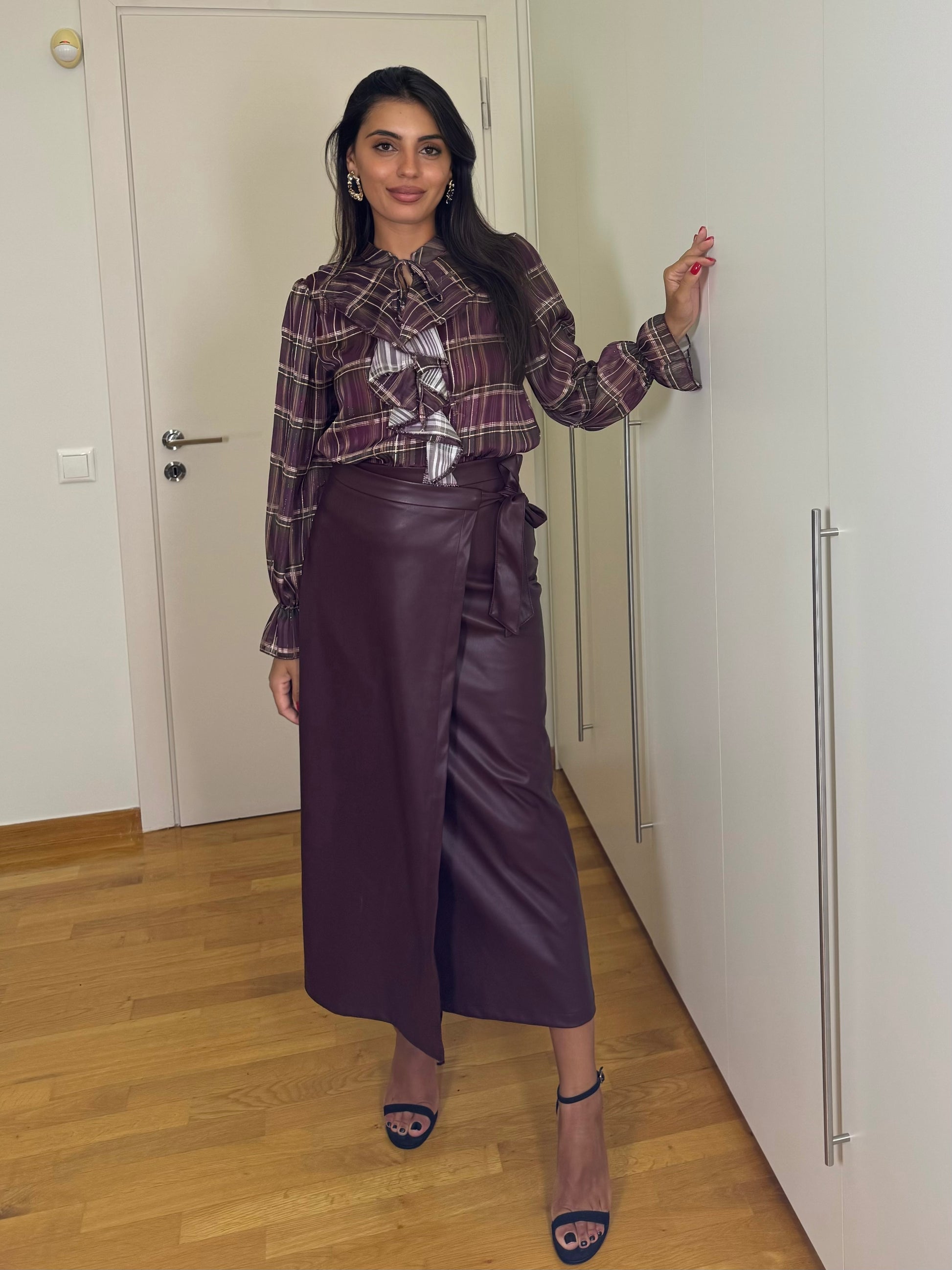 Αναβάθμισε το στυλ σου με αυτή τη μοδάτη wine φούστα που συνδυάζει την κομψότητα με μια μοντέρνα πινελιά. Το σχέδιο σαν ποδιά προσδίδει ιδιαίτερο χαρακτήρα, ενώ η υφή δερματίνης χαρίζει μια διακριτική λάμψη και αίσθηση πολυτέλειας.