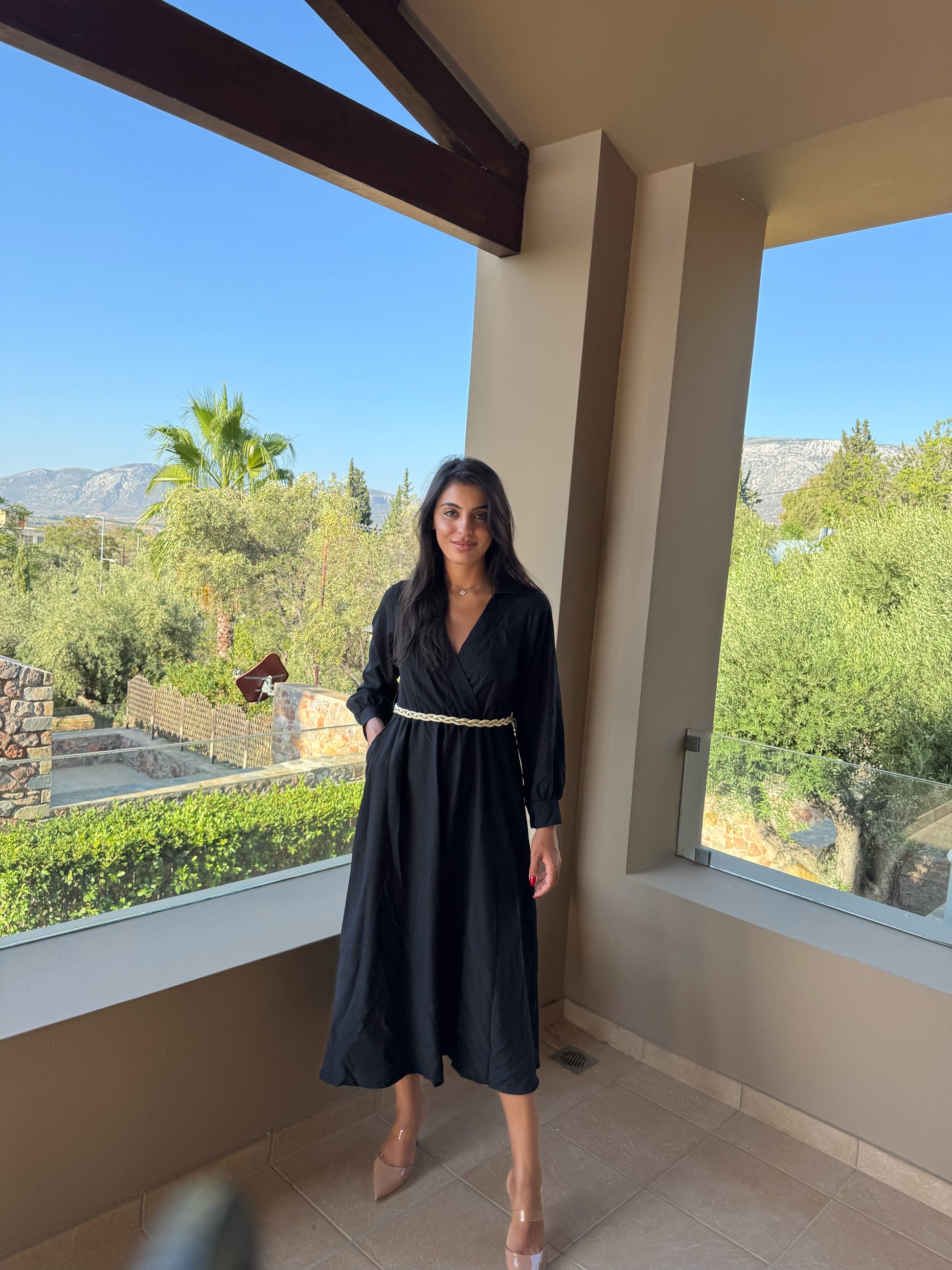 Αναδείξτε το στυλ σας με αυτό το κομψό μαύρο midi φόρεμα. Διαθέτει μακρύ μανίκι και V λαιμόκοψη, ενώ η ελαφριά, αέρινη γραμμή του χαρίζει άνεση και θηλυκότητα.